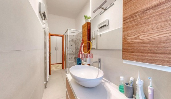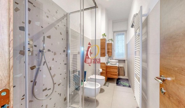 Il bagno, recentemente ristrutturato, è moderno ed elegante, dotato di ampia doccia e finiture contemporanee.